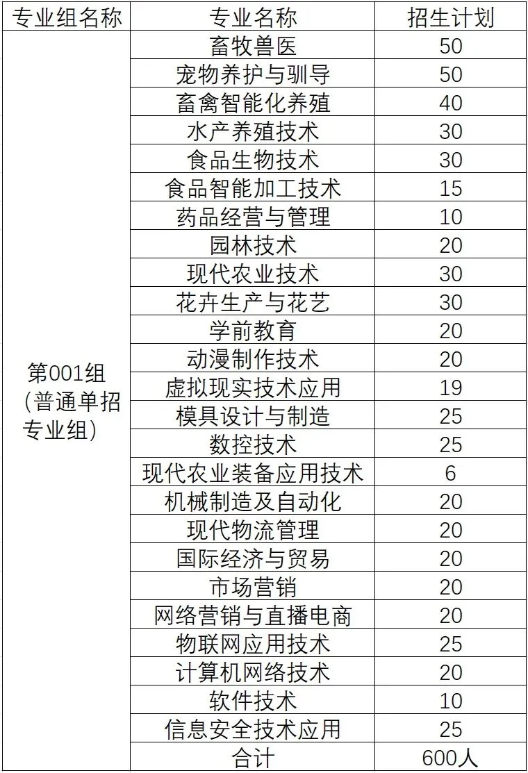 学院高职单独招生总计划600人,专业报考不区分普通高中毕业生与中职毕业生。