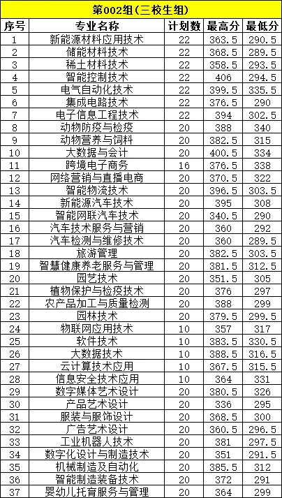 002组三校生其他类中非井冈山应用科技学校联合培养专业最低控制线280分,井冈山应用科技学校联合培养的电子商务和电子信息工程技术专业最低控制线234分;