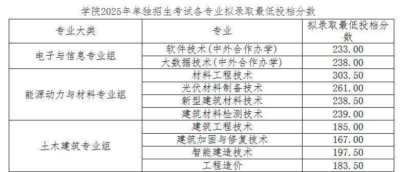 学院2025年高职单招第001组(普通单招专业组)最低录取控制线为340分(总分相同情况下,职业适应性测试控制线为184分),第002组(“一村一名大学生工程”专业组)最低录取控制线为170分。