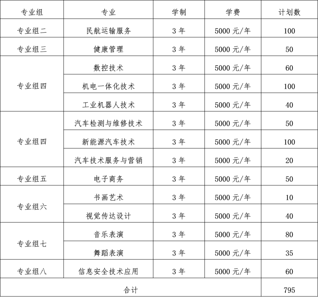 我校2025年江西省单招计划数为80人,具体分专业计划及学费标准如下表:专业组 | 专业名称 | 计划数 | 学费 (元/年) | 学制 |