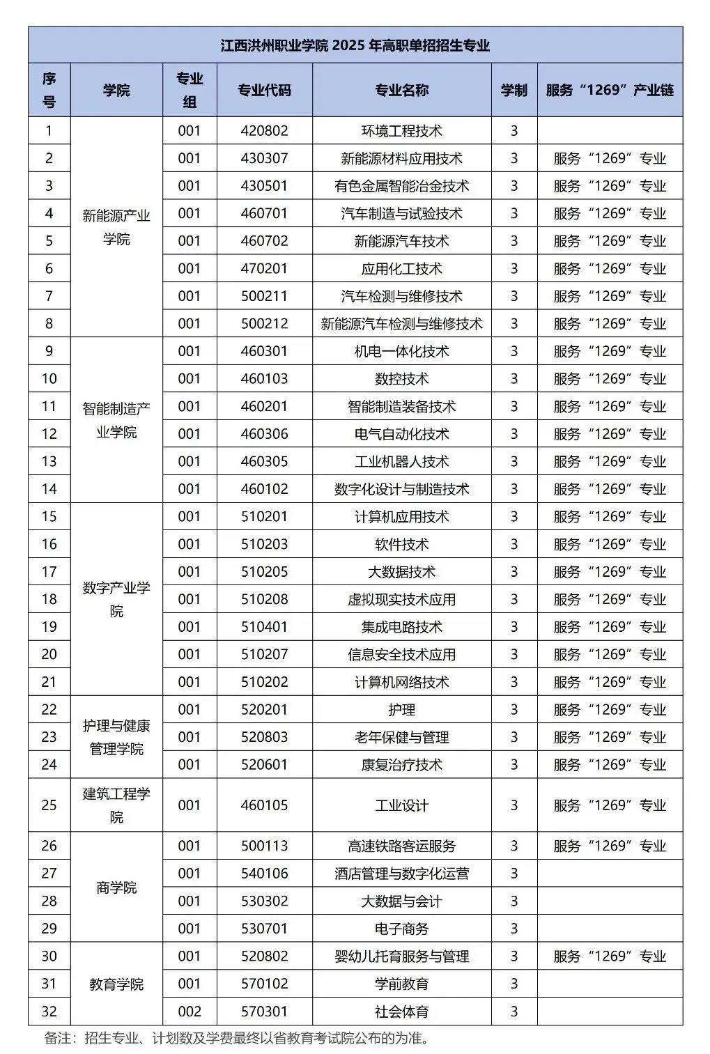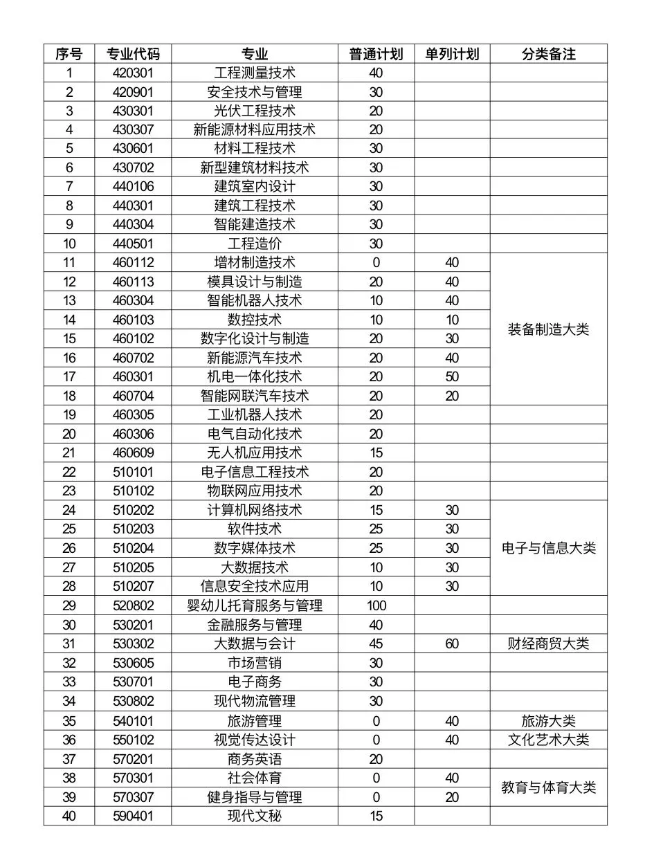 2.当某专业合格生源不足时,主干专业、服务“1269”行动计划重点产业链专业、服务民生或地方产业相关专业间可进行计划调整,但不得转为其他专业;其他专业计划可调整为主干专业、服务“1269”行动计划重点产业链专业、服务民生或地方产业相关专业招生计划。