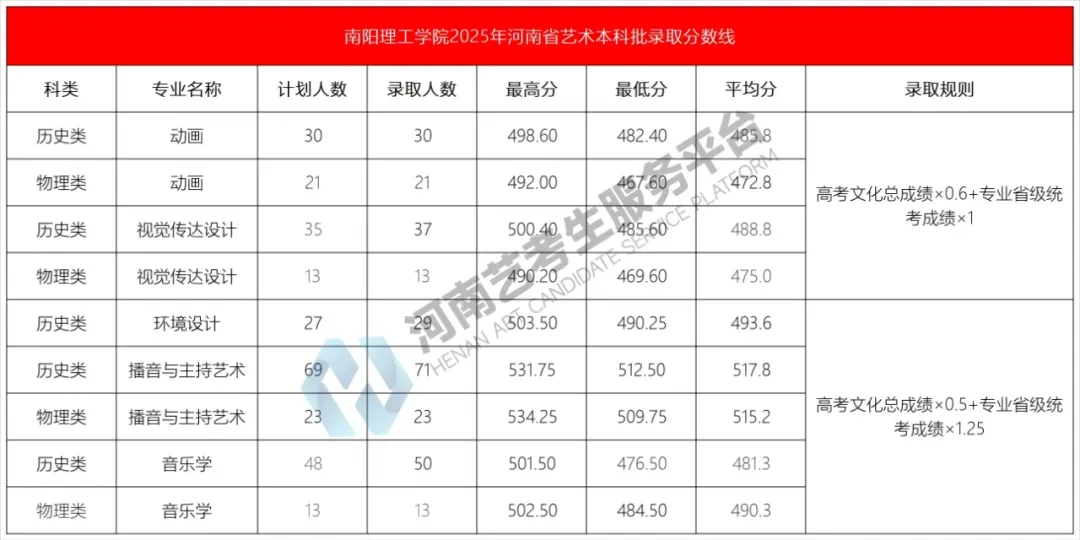 >南阳理工学院2025年河南省艺术本科批录取分数线