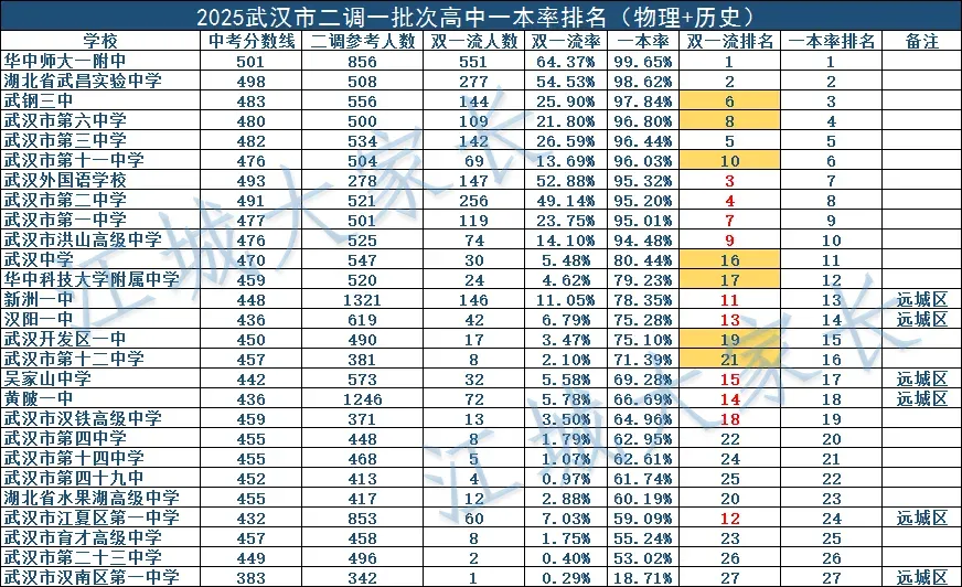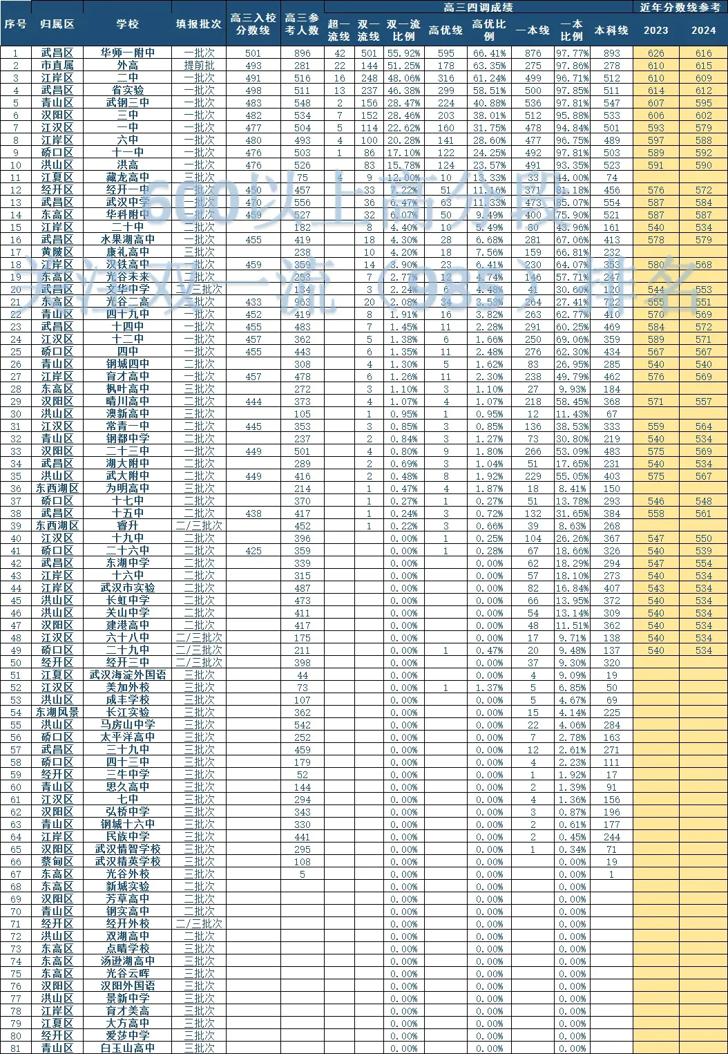 把洪高放在这一篇里讲着实委屈,洪高早年与九大名高并称十大名高,近两年分数线更是超越九大,出口成绩也是颇为亮眼,往年曾有高考出分洪高烟花绽放的新闻。洪高的进步不是一蹴而就,而是多方面共同努力的结果:一方面洪高是洪山区唯一的一批次高中,而洪山区虽然教育资源相对薄弱,但居住有大量高校教师等重视教育的家庭,使得洪高的生源池相对优质;另一方面洪高也积极努力提高学生成绩,在校时间长,管理严格,誓要打造武汉一流高中。但是洪高还有一个值得注意的地方:2025年签约保班只保了三个月,期中考试后进行了大范围的调整和重新分班。如果目标洪山高中在初升高衔接阶段一定要重视,如果暑假努力则有机会在高一上期中分到更好的班型。