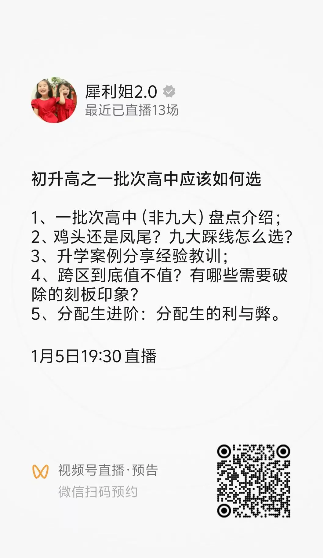 今天这一篇,同样希望提供像工具书一样方便家长查阅了解一批次高中的方式,又能言简意赅帮大家总结选择的思路。如果大家觉得实用,记得关注点赞转发,犀利姐才有动力继续花费大量时间精力出品类似的文章哦!!!感谢大家支持!更多升学信息可以扫码进群探讨!更多新鲜升学资讯,可以预约今晚的直播哦!