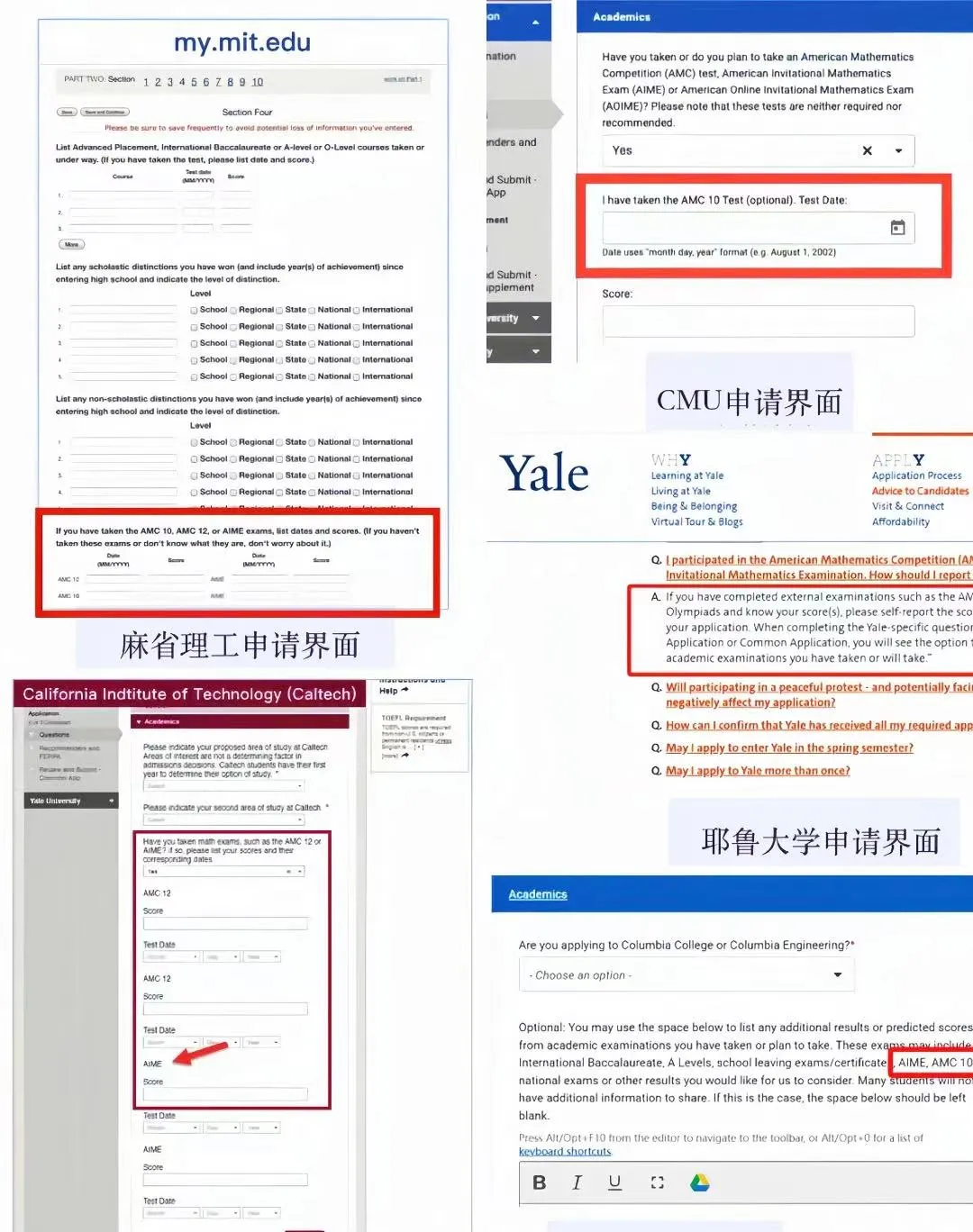 在大学申请中,AMC10数学竞赛的成绩是一个重要的加分项,尤其是对于那些希望进入顶尖大学如:麻省理工学院(MIT)、哈佛大学(Harvard)等的学生。在这些学校申请界面会直接要求提交AMC成绩!