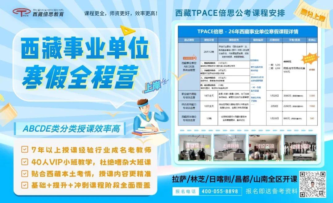 26年西藏公务员笔试(25年12月28日)已结束,26年西藏事业单位成为备考焦点!综合管理类(A 类)作为招录热门,近三年岗位、分数线趋势清晰,备考方向更明确,搭配独家题量分值资料,上岸更高效~