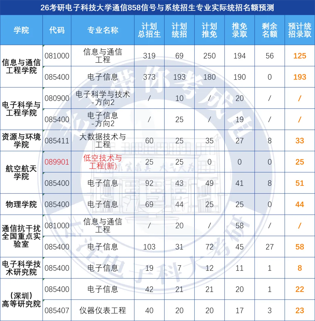 电子科技大学858各专业的26考研实际统招人数预计整体上仍会保持往年的规模,某些专业会有小幅度变动。
