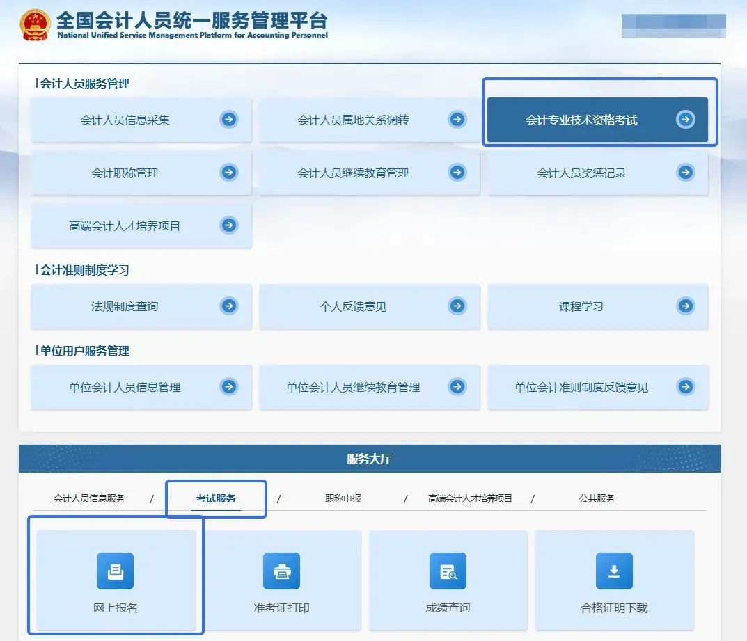 2️⃣登录成功后,点击“会计人员服务管理-会计专业技术资格考试”进行会计报名。