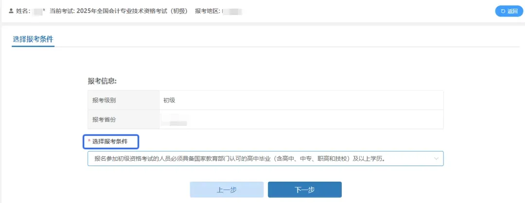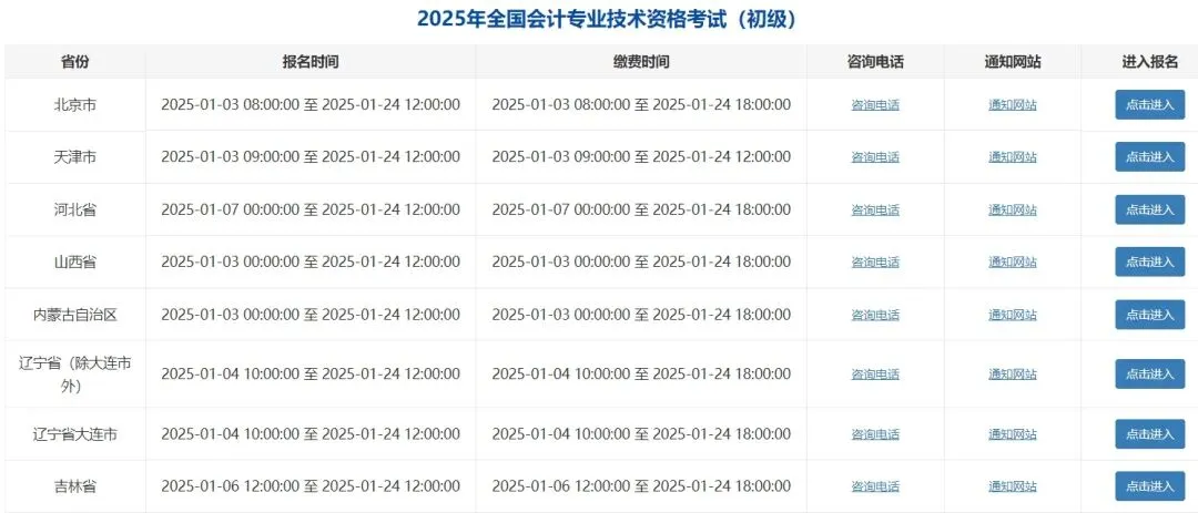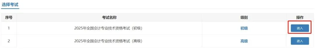 3️⃣进入报名界面后,选择2025年全国会计专业技术资格考试(初级),点击“进入”按钮进行报名。