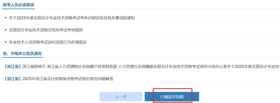 5️⃣阅读网上报名承诺以及中华人民共和国刑法条例,选择“完全同意”和“已阅读并知晓”。完成阅读须知后,进入到所选择省份设置的通知公告页面,包括报考人员必读事项以及省、市相关公告及通知。点击“已阅读并知晓”,如下图所示:7️⃣进入“填写报名信息”。(因篇幅有限,仅展示部分)输入完毕后,点击“确认无误,下一步”。