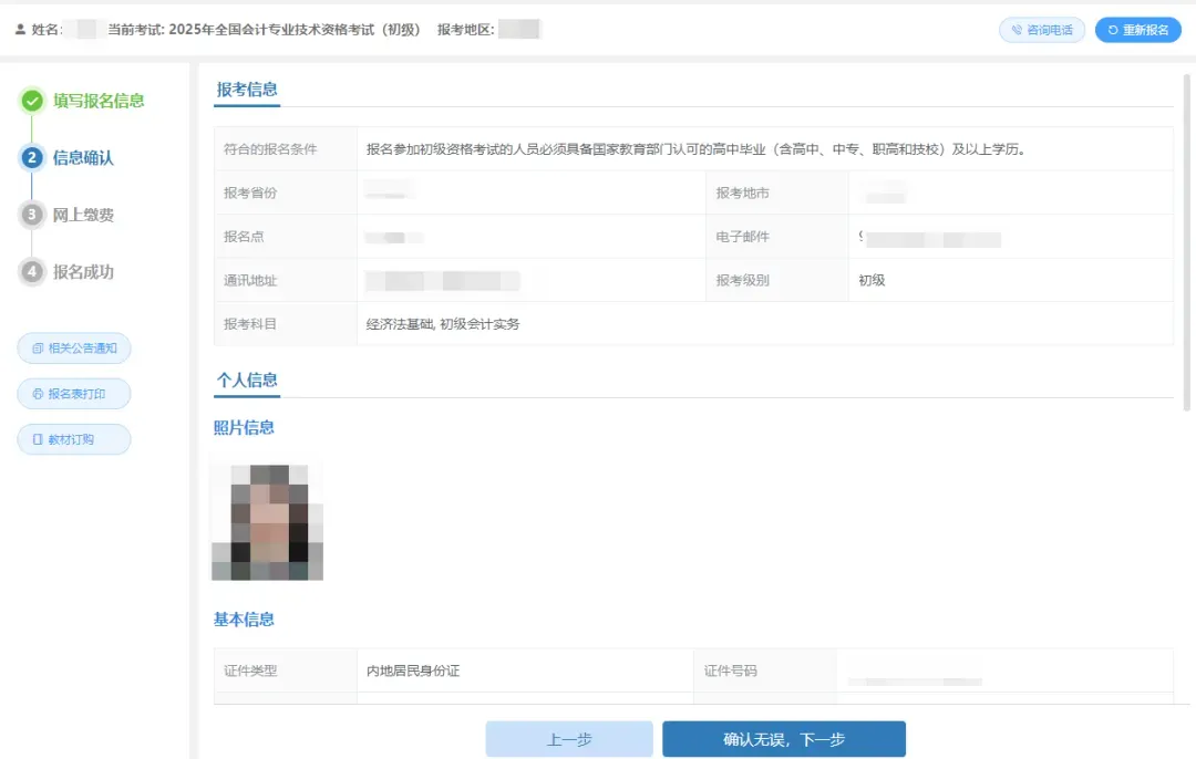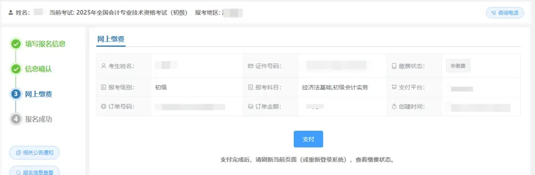 8️⃣进入“信息确认”页面,确认自己填写的报考信息无误后,点击“确认无误,下一步”。9️⃣进入“网上缴费”页面,确认信息无误后,点击“生成订单”。🔟 生成订单后,页面显示考生信息及订单金额,点击“支付”,进行缴费。①若报考省份采用考后资格审核并已开通网上缴费,可点击“网上缴费”进行报考费用支付;