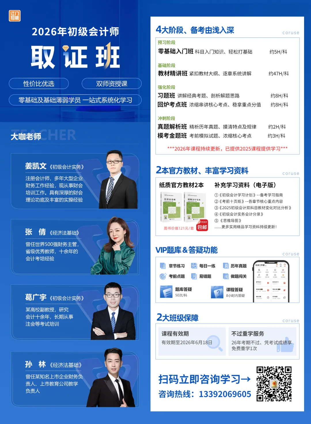 🚀0基础、又想追求性价比,又需要专业老师带学、对题库需求较高的同学,建议一步到位选择【26年初级会计取证班】,大家可以趁年终钜划算活动赶紧报名~
