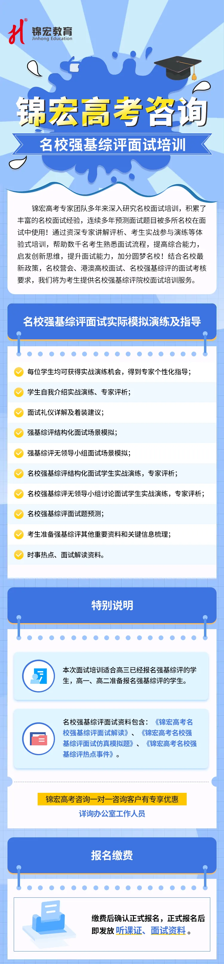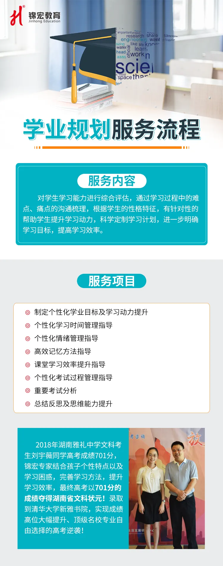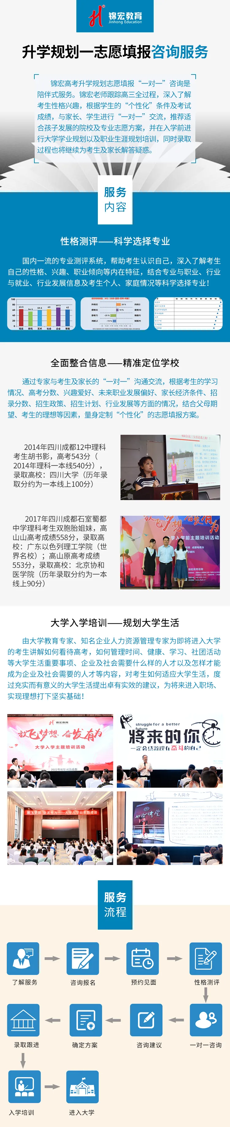 锦宏教育升学规划志愿填报“一对一”咨询是陪伴式服务。锦宏老师跟踪高三全过程,帮助考生明确目标,清晰规划;深入了解考生性格兴趣,根据学生“个性化”条件及考生成绩,通过专家与家长、考生“一对一”的交流咨询,为考生量身定制科学的升学规划方案,并在入学前进行大学学业规划以及职业生涯规划培训。