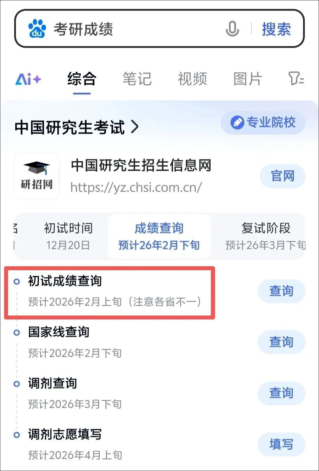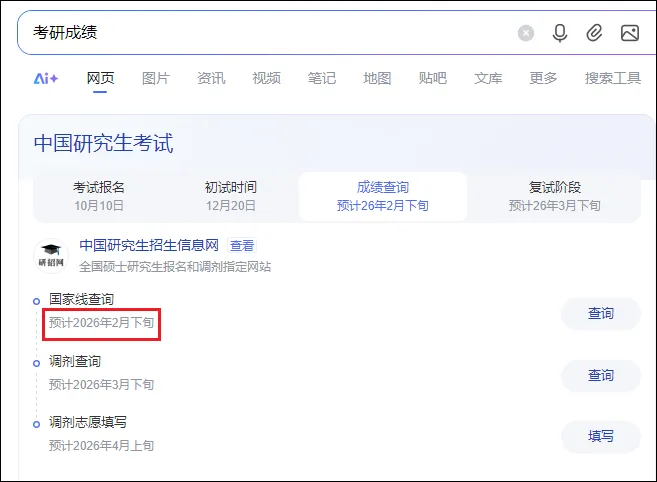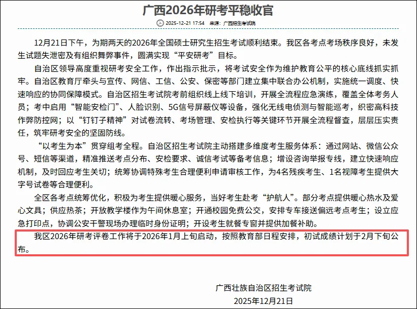 再比如广西壮族自治区招生考试院:2026年研考评卷工作将于2026年1月上旬启动,初试成绩计划于2月下旬公布。