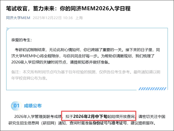 比如同济大学:2026年入学管理类联考成绩,拟于2026年2月中下旬起陆续开放查询。