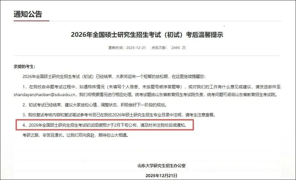 再比如山东大学:2026年全国硕士研究生招生考试初试成绩预计于2月下旬公布。