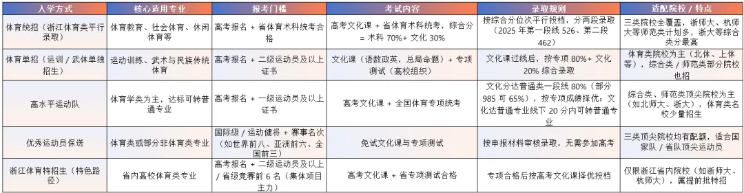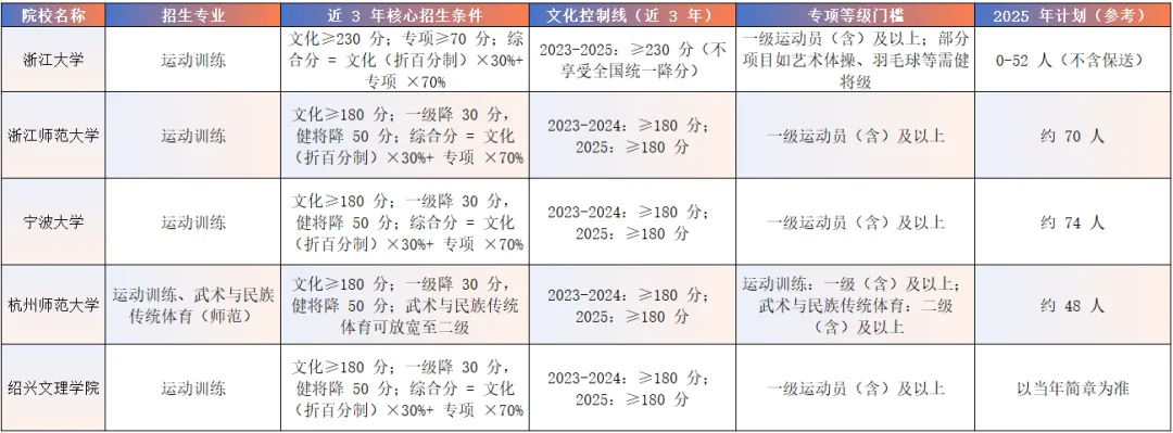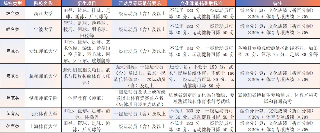 以下是近 3 年(2023-2025)浙江高水平运动队招生的部分院校名单、招生项目、运动员等级与文化课最低录取标准,按综合类、师范类、体育类院校分类整理,数据以院校官方简章及浙江省教育考试院公示为准。