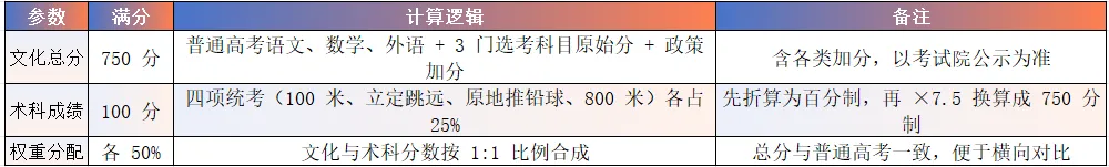 浙江体育统考综合分满分为 750 分,采用 “文化与术科各占 50% 权重” 的计算方式,具体公式与关键规则如下: