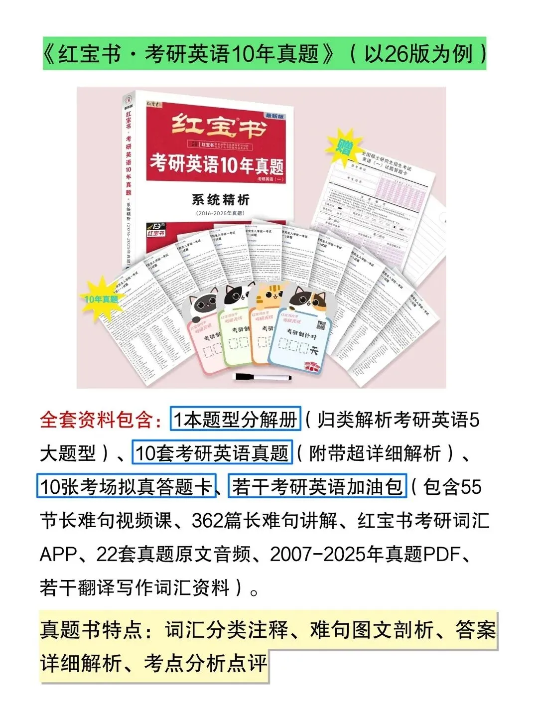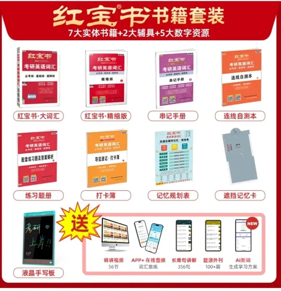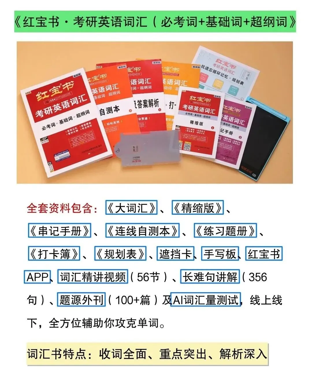 宝子们!考研英语备考不用再东拼西凑找资料啦~ 红宝书为大家配齐了“词汇+真题+作文”全套备考用书,承包你的备考全程,帮你少走弯路,高效冲刺!