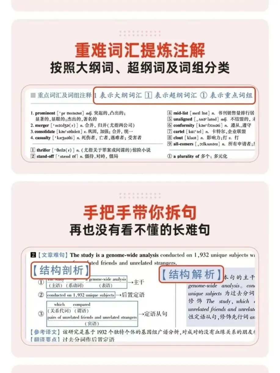 🔹还对每篇阅读做了逐句精讲,词汇、长难句逐一解析,让阅读无障碍,基础弱的宝子也能轻松看懂~