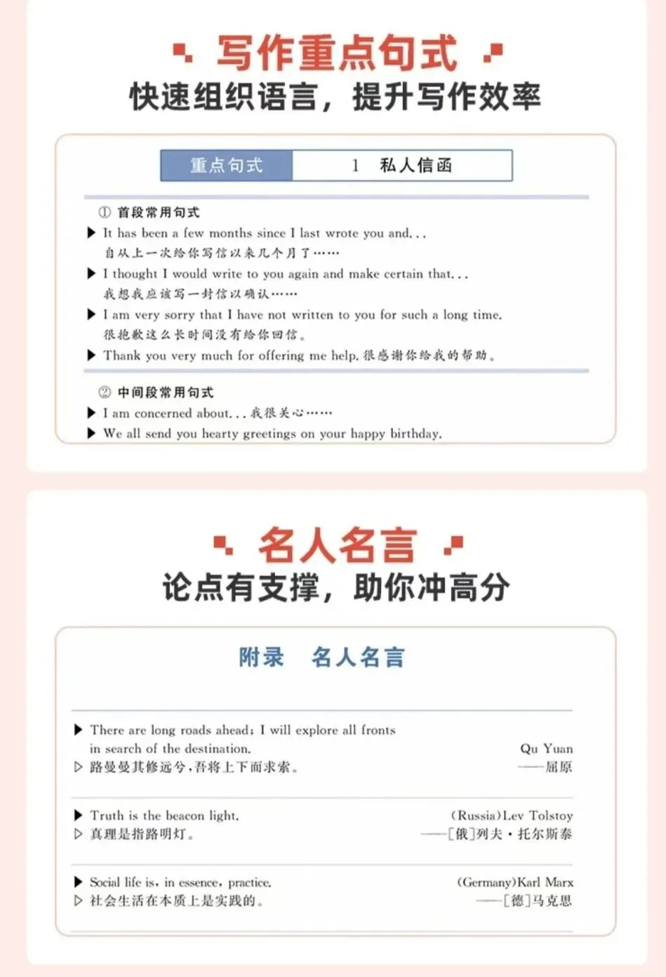 🔹精选万能句式和高频表达,帮你快速搭建写作框架,再结合真题练习仿写,考场上就能灵活运用,轻松写出高分作文!