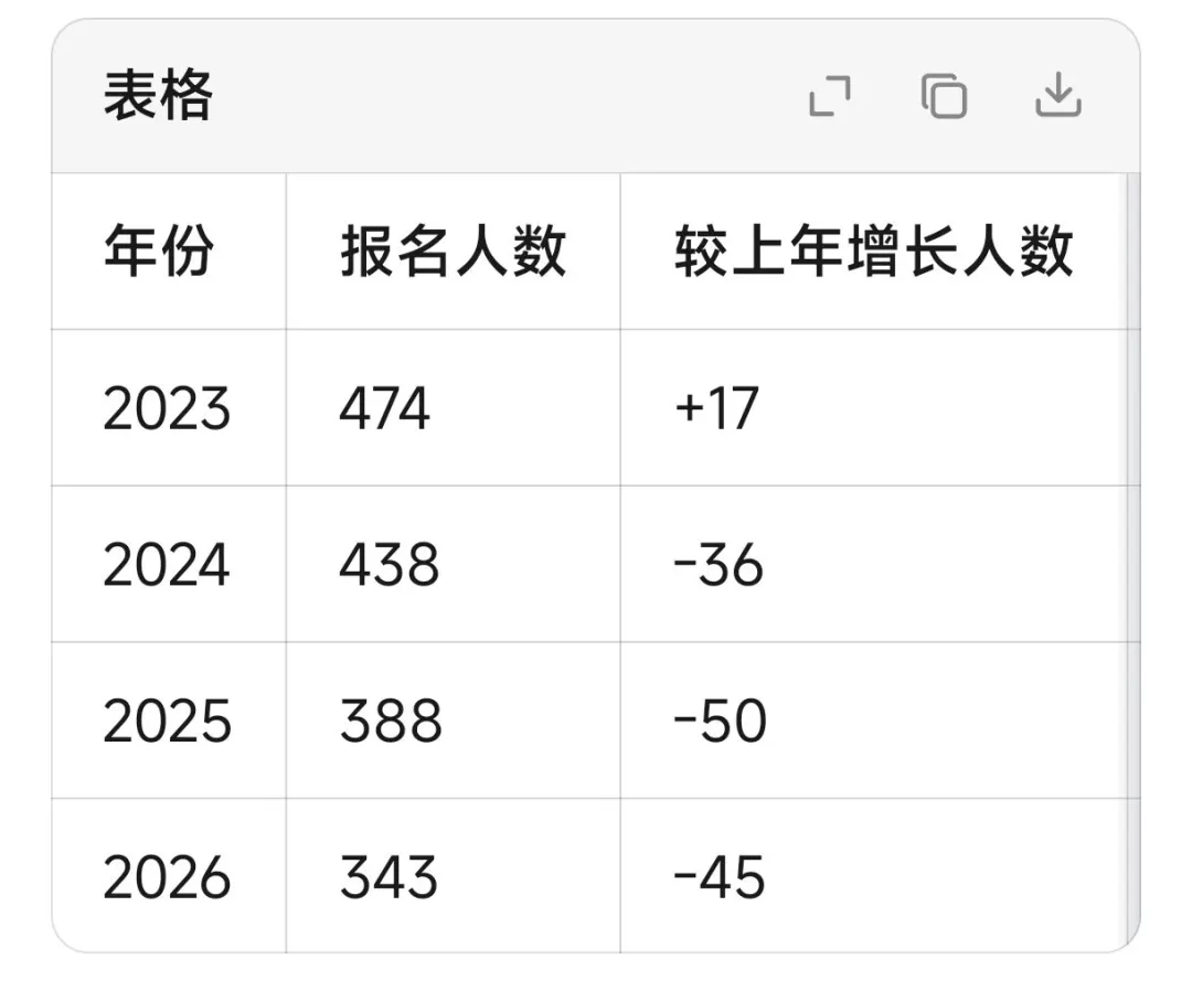 从2024年开始,考研报名人数每年都在下降,2024年下降了36万,2025年下降了50万,2026年又下降了45万人。