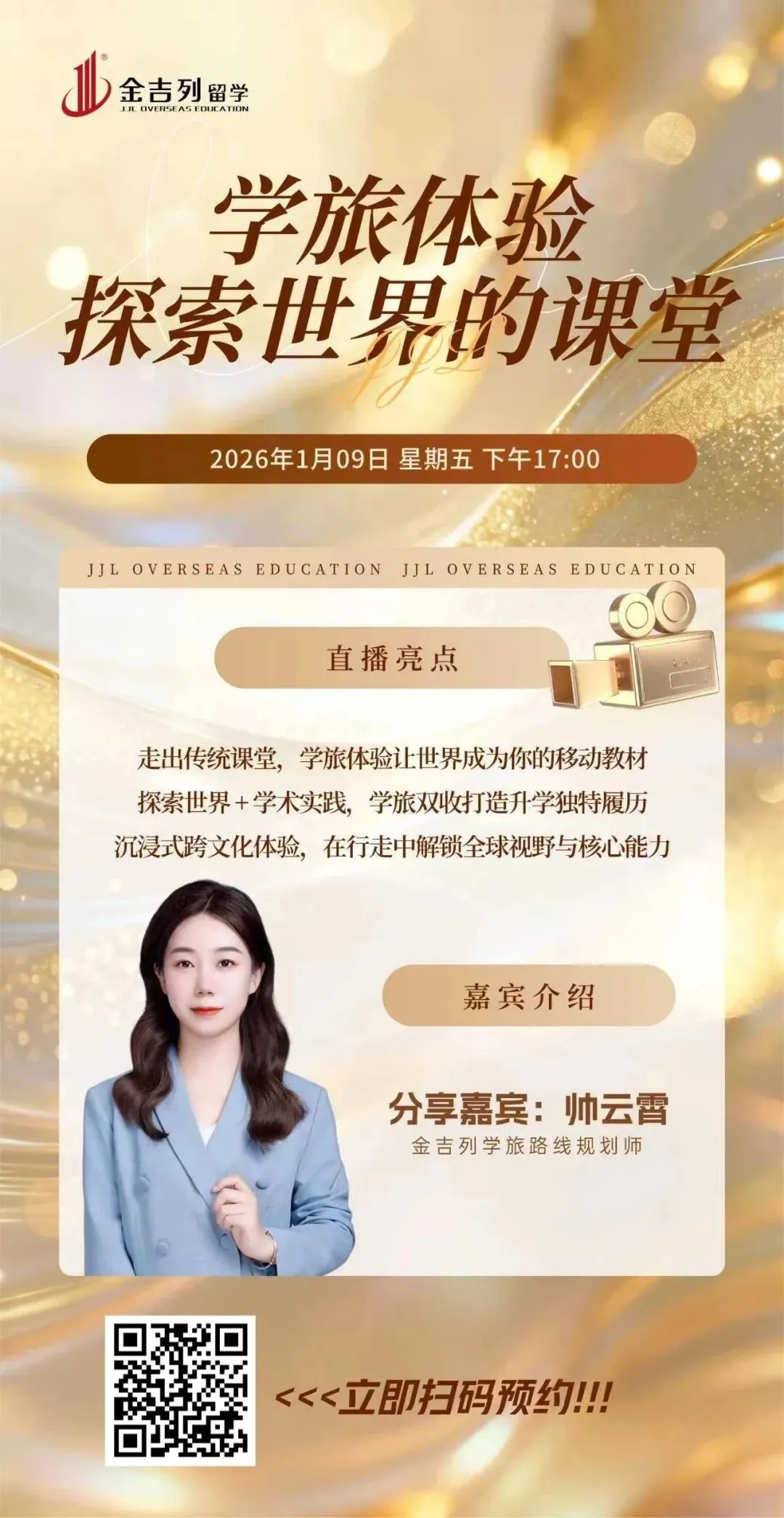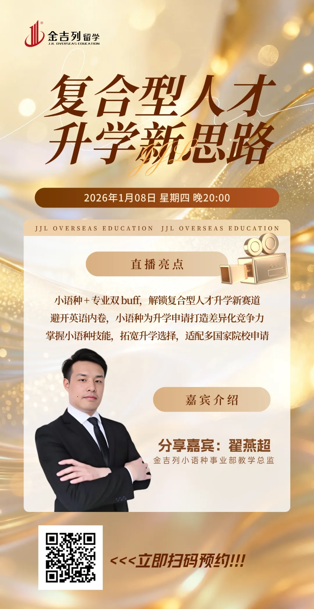 2026 年 1 月 8 日(星期四)晚 20:00,金吉列小语种事业部教学总监翟燕超将开启直播分享,深度解析小语种如何助力复合型人才升学,为你的留学申请规划打开新思路~