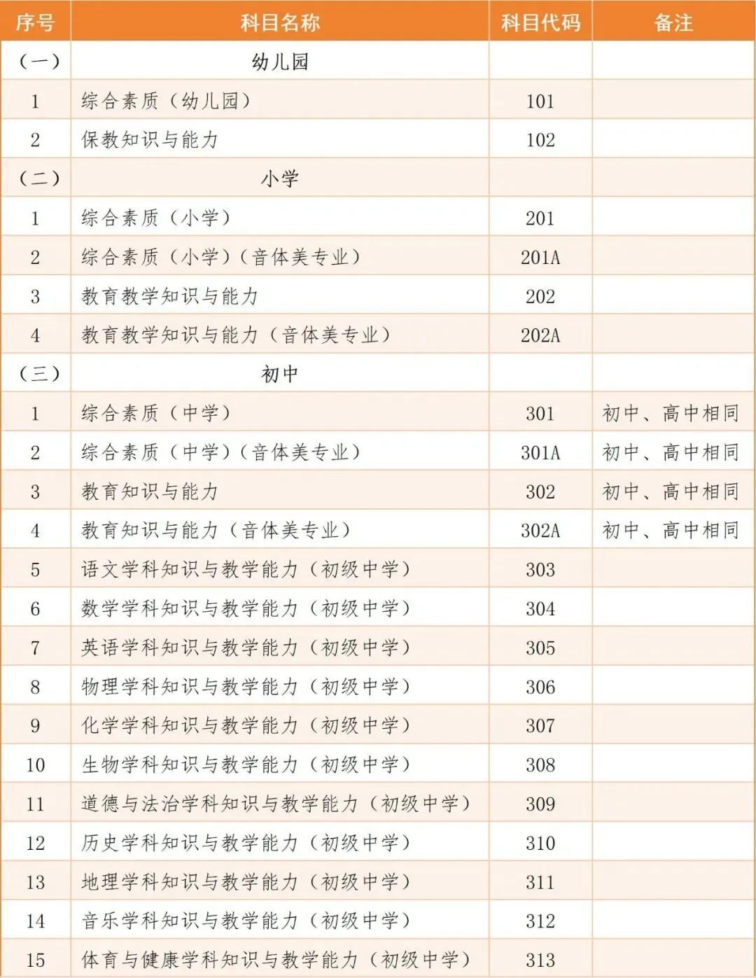 (三)初级中学《学科知识与教学能力》科目为:语文、数学、物理、化学、生物、历史、地理、道德与法治、英语、音乐、美术、体育与健康、信息技术、历史与社会、科学等15个学科。