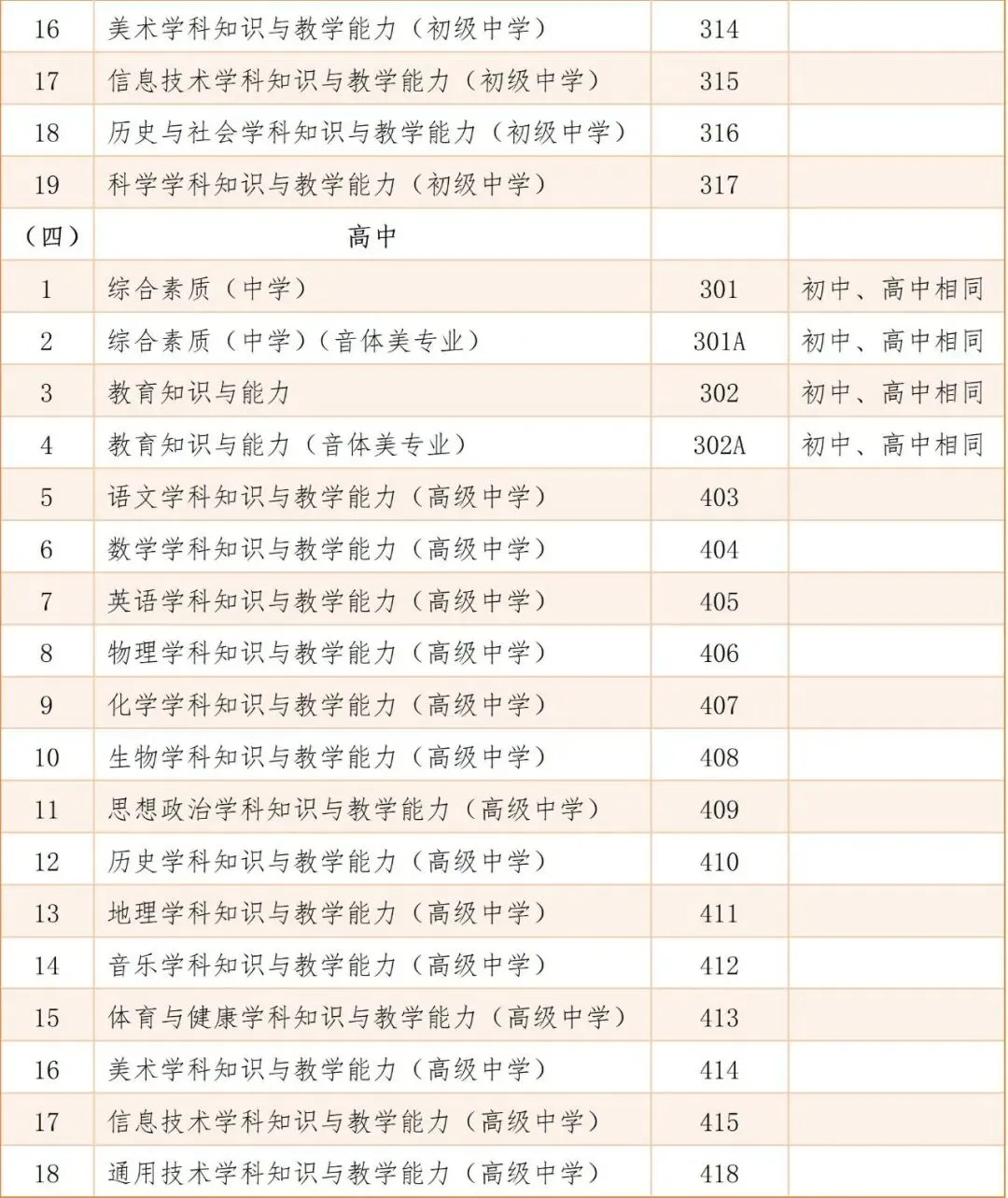 (四)高级中学《学科知识与教学能力》科目为:语文、数学、物理、化学、生物、历史、地理、思想政治、英语、音乐、美术、体育与健康、信息技术、通用技术等14个学科。
