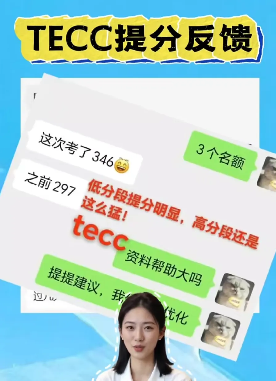 2025年3月,直通车推出了tecc系列备考资料,整套资料只有题库和词汇,整体优化效果有待进一步提高,被吐槽最多的是M类题型少。
