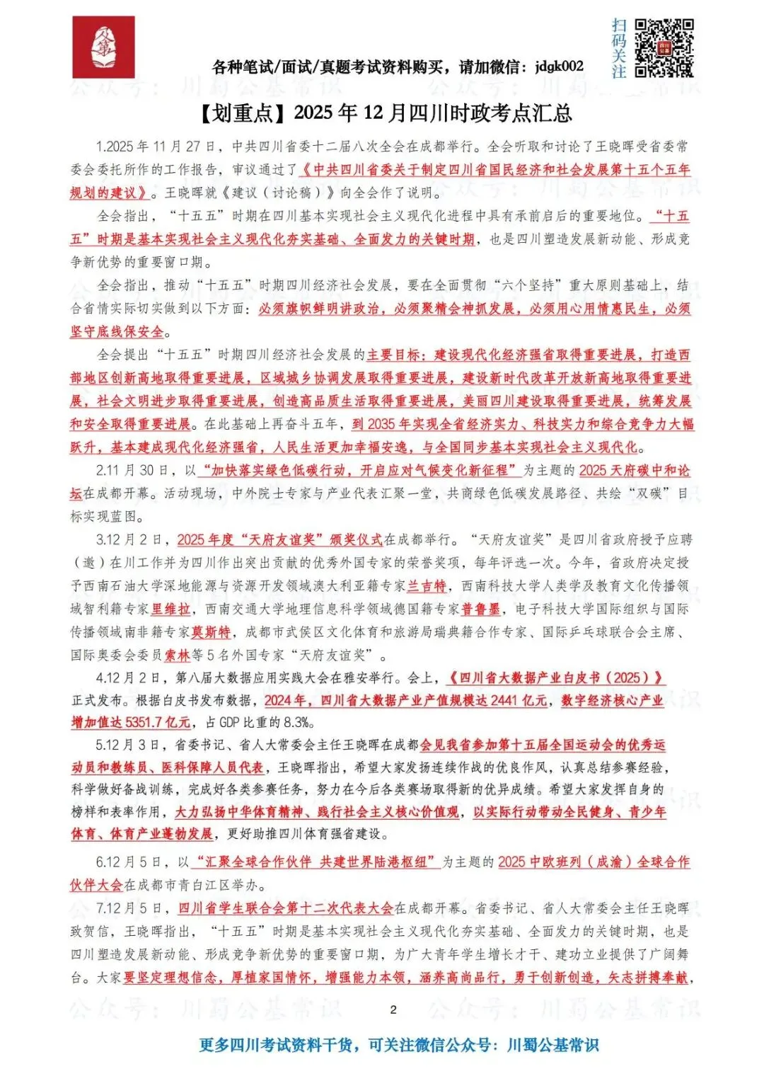 【四川时政考点汇总】内含2025年1月—2025年12月四川时政考点,全部为四川地方时政知识点,包含,四川省委经济工作会议、中共四川省委十二届八次全会、中共四川省委十二届七次全会、2025年四川省委一号文件、总书记在四川考察等,重点加红并加下划线,共计55页;