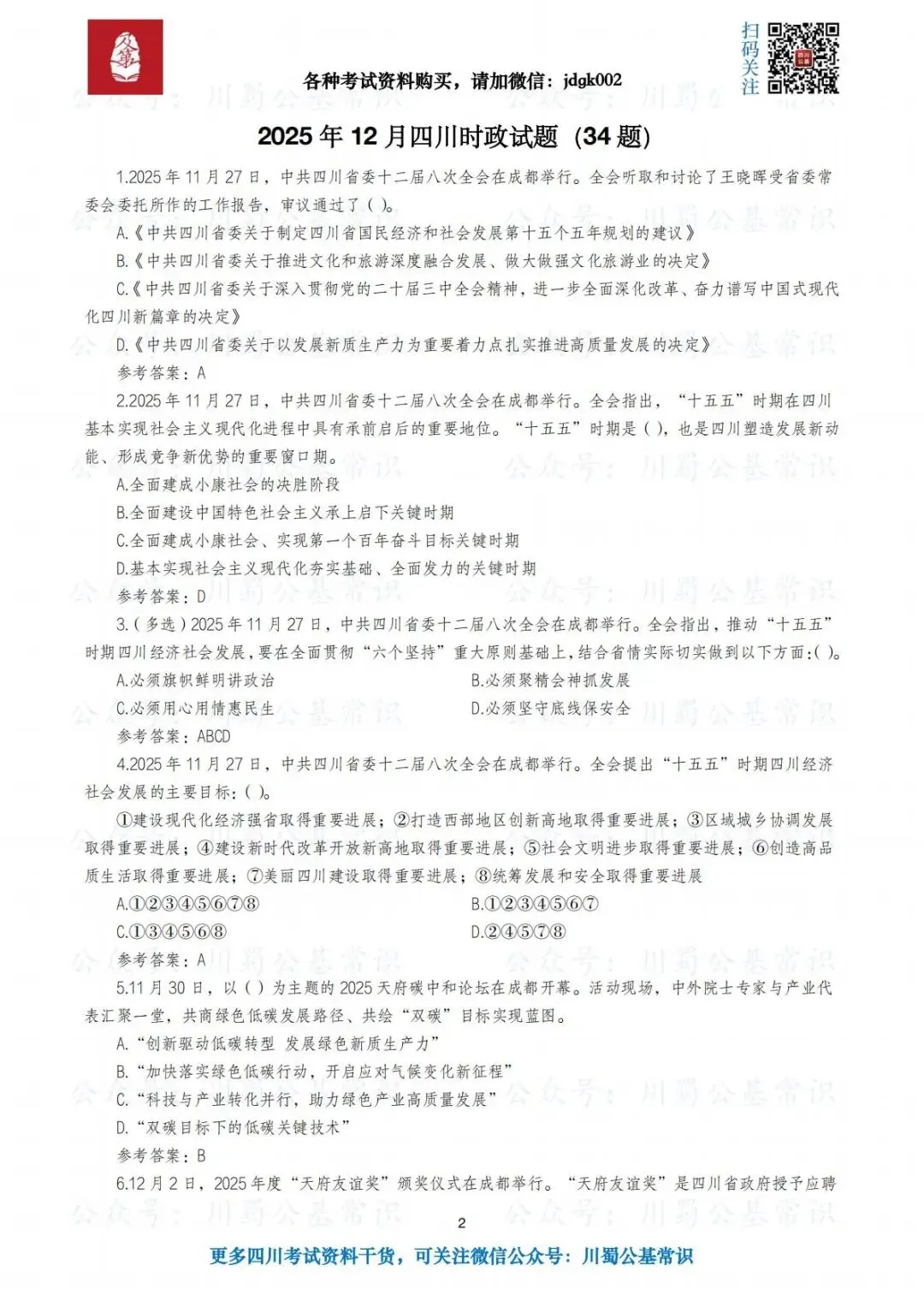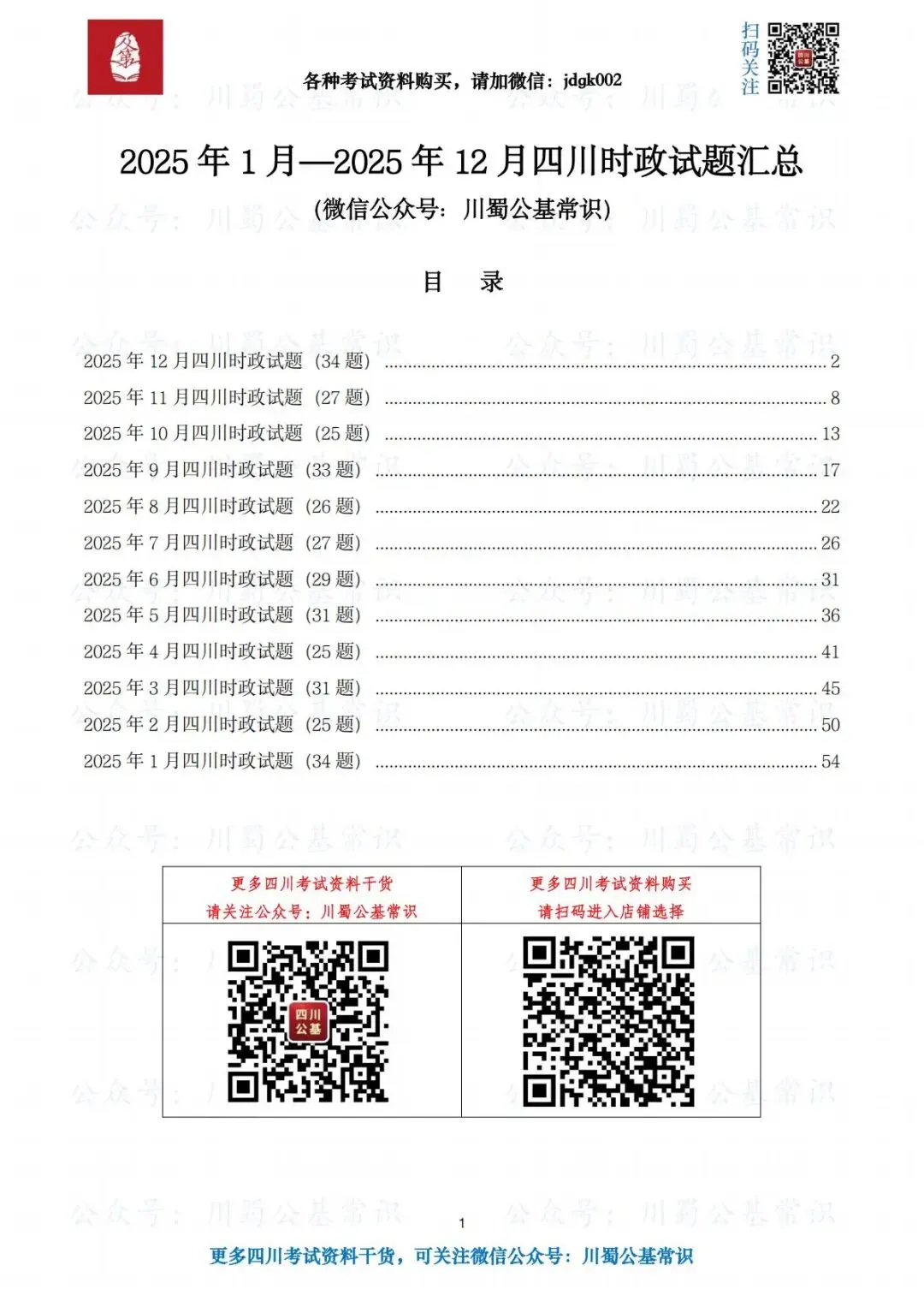 【四川时政试题汇总】内含2025年1月—2025年12月四川时政试题,全部为四川地方时政试题,共计347题,题后附参考答案,总计58页;