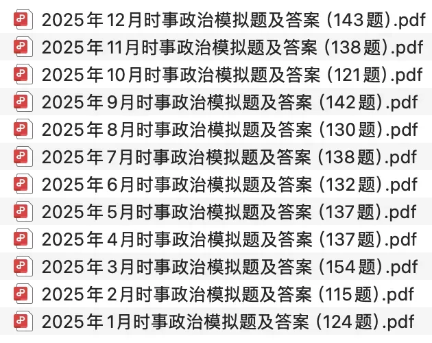 【重要考点包】2026年新年贺词;中央经济工作会议;中央农村工作会议、十五五规划建议、二十届四中全会、新疆维吾尔自治区成立70周年庆祝大会;纪念中国人民抗日战争暨世界反法西斯战争胜利80周年大会;2025年全国两会政府工作报告;2025中央一号文件;二十届中央纪委四次全会;二十届三中全会;二十大;全国统一大市场;党的第三个历史决议等相关考点或练习题,每个文件10-30页,20个文件左右。