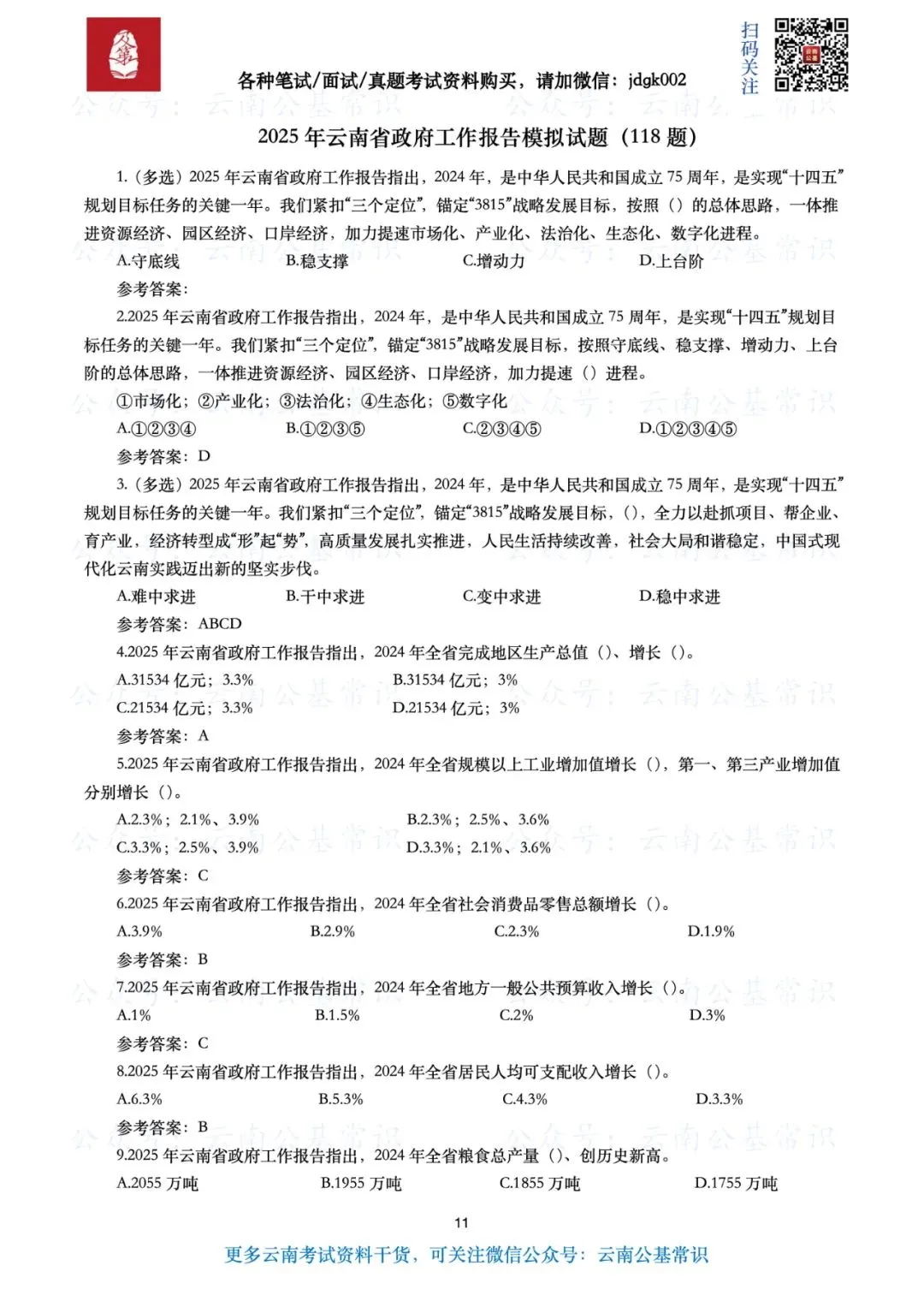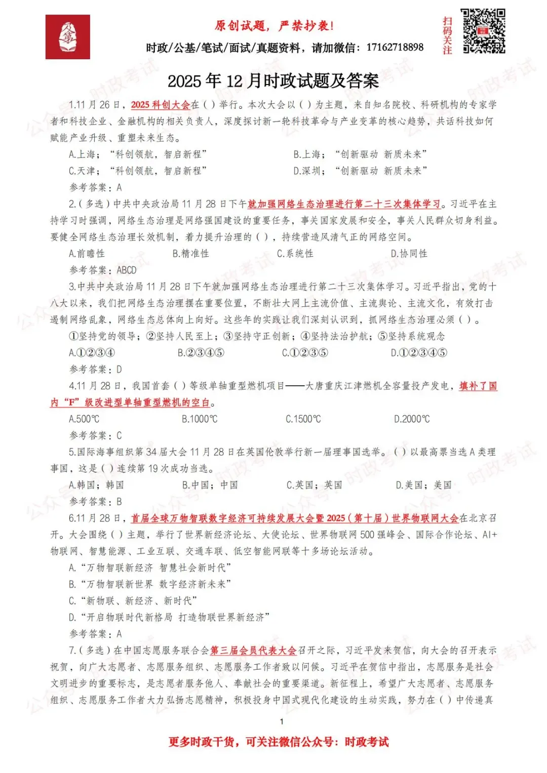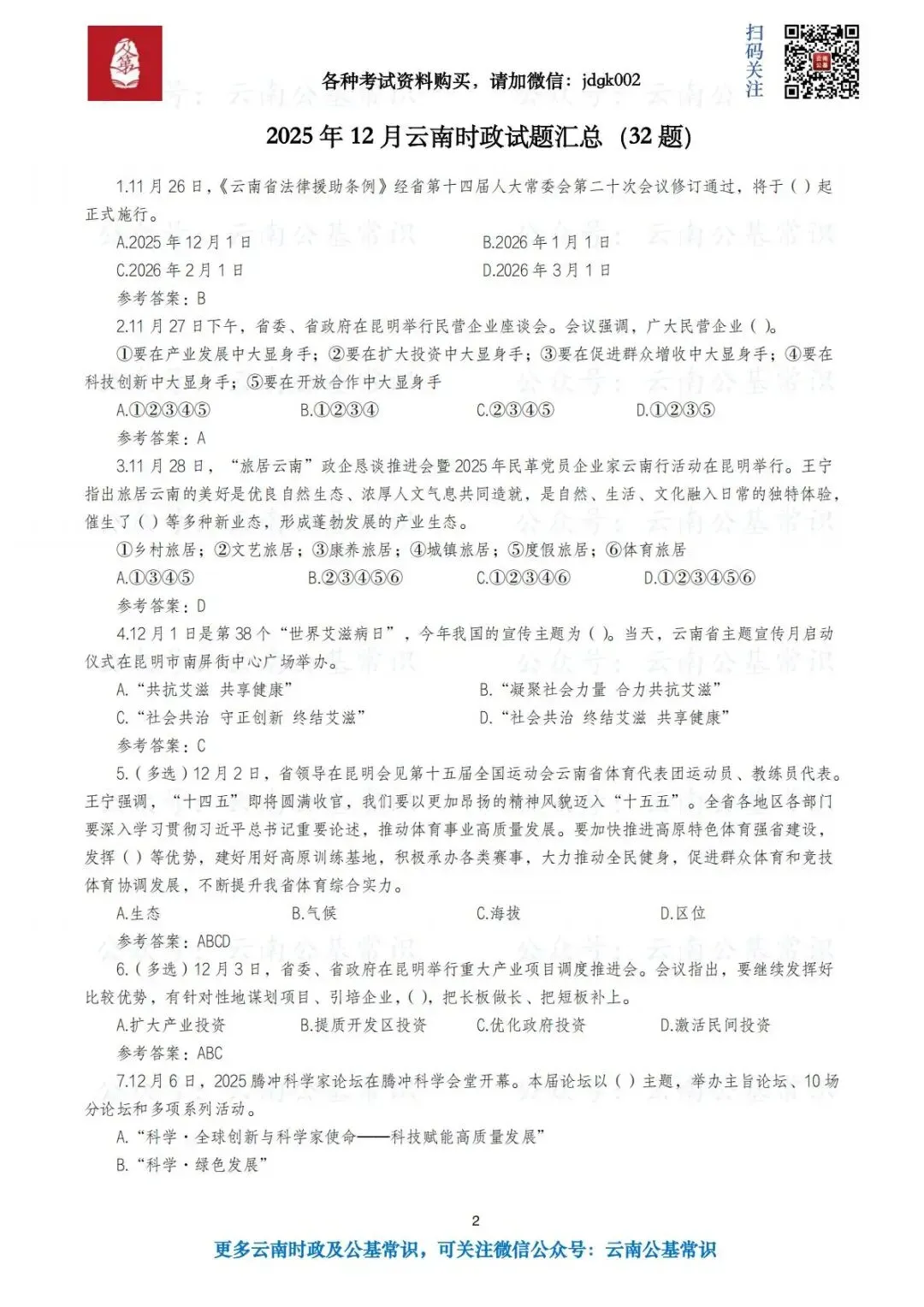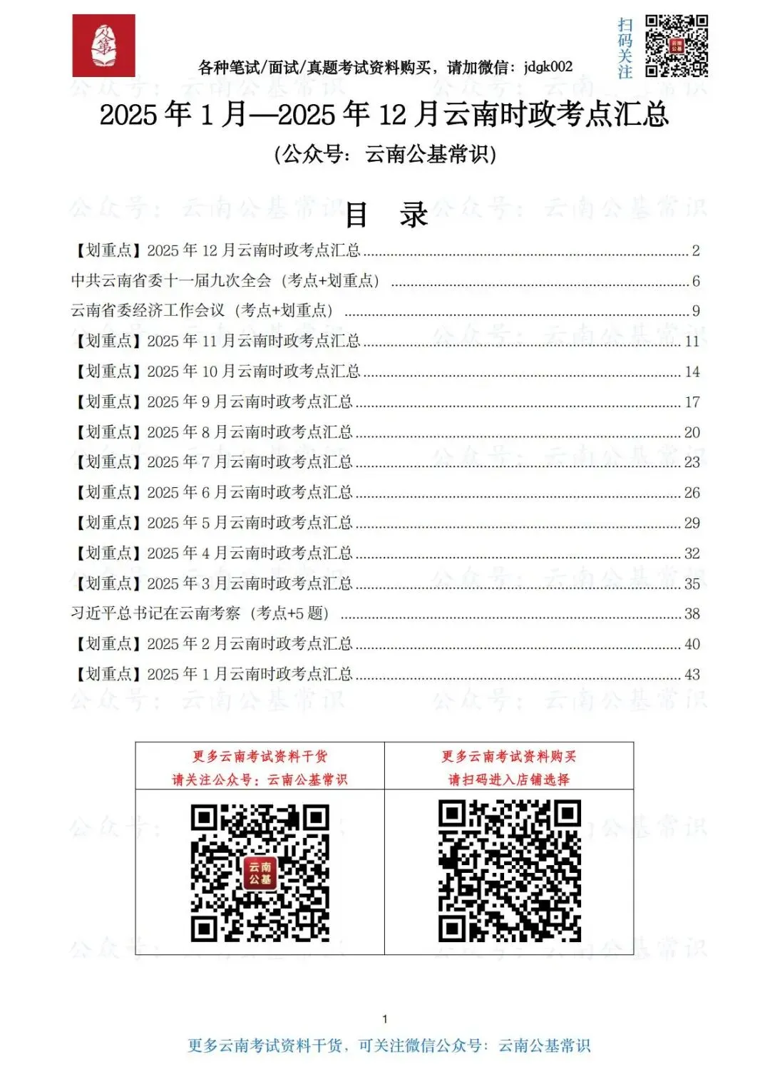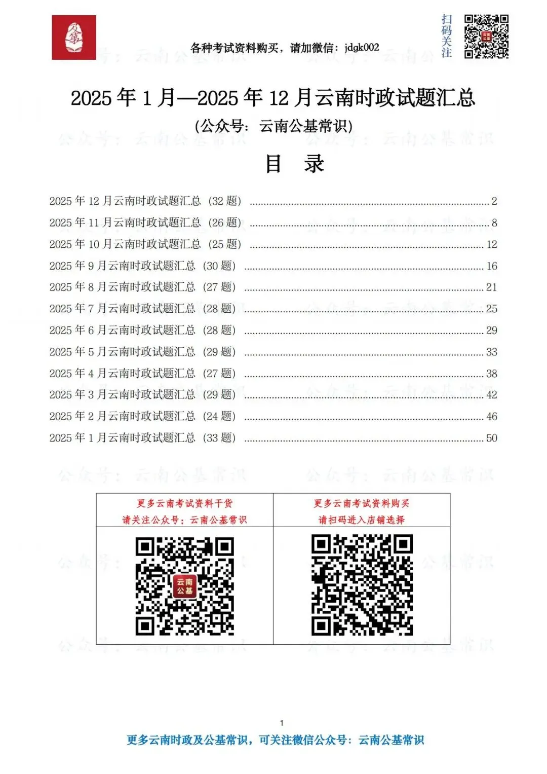 【云南时政试题】内含2025年1月—2025年12月云南时事政治试题,全部是云南地方时政,共有338题,题后附参考答案,总计54页。后附目录及样页;