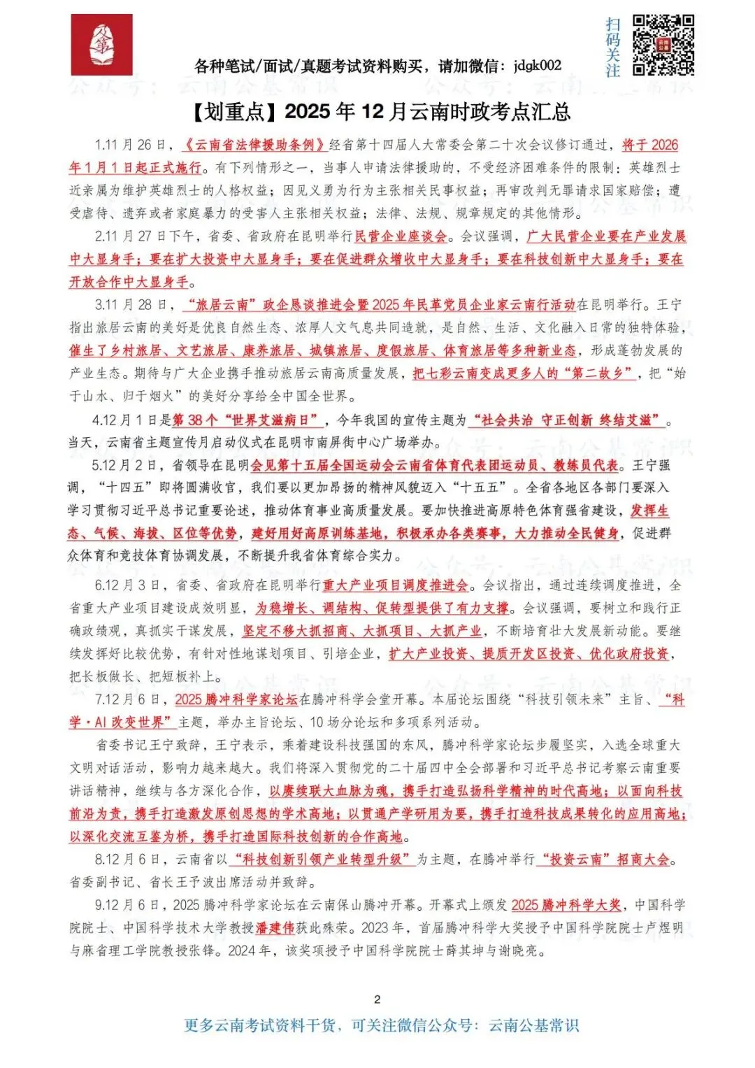 【云南时政考点】内含2025年1月—2025年12月云南时事政治考点,全部是云南地方时政,含云南省委经济工作会议、中共云南省委十一届九次会议、总书记云南考察等重点加红并加下划线,共计45页;