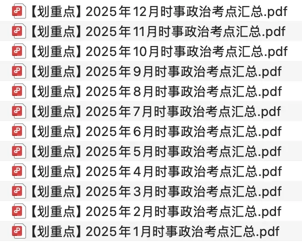 【重要考点包】2026年新年贺词;中央经济工作会议;中央农村工作会议、十五五规划建议、二十届四中全会、新疆维吾尔自治区成立70周年庆祝大会;纪念中国人民抗日战争暨世界反法西斯战争胜利80周年大会;2025年全国两会政府工作报告;2025中央一号文件;二十届中央纪委四次全会;二十届三中全会;二十大;全国统一大市场;党的第三个历史决议等相关考点或练习题,每个文件10-30页,20个文件左右。