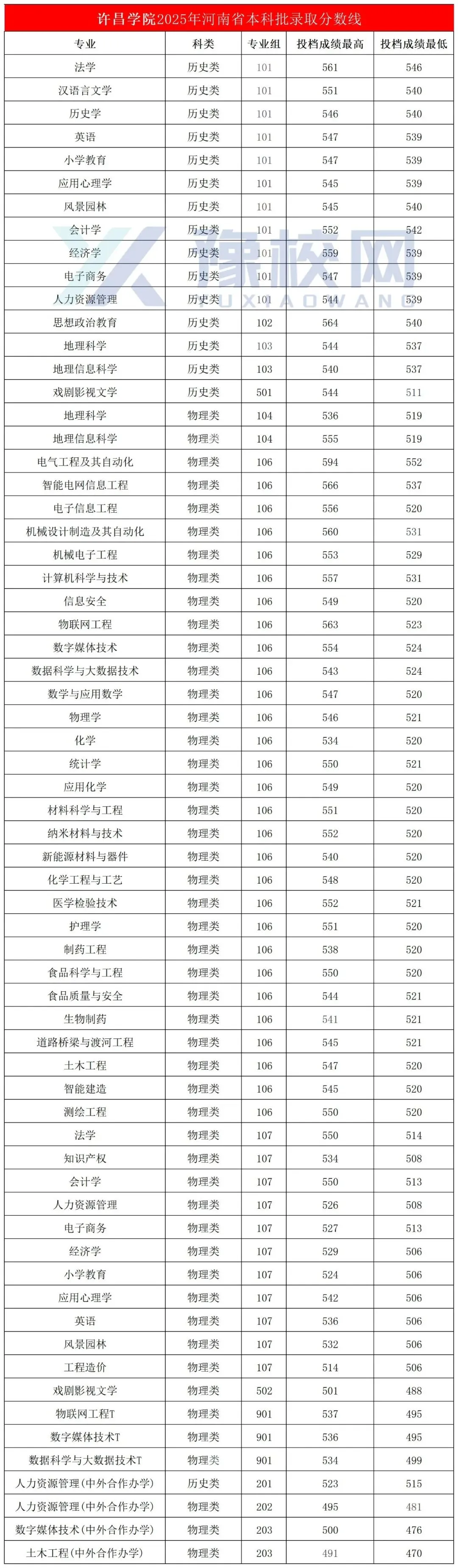>许昌学院2025年河南省本科批录取分数线
