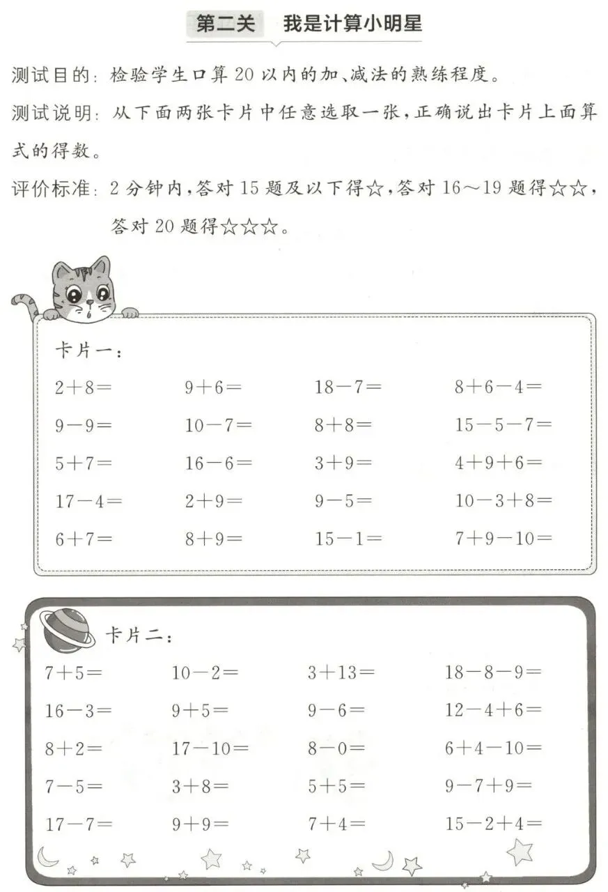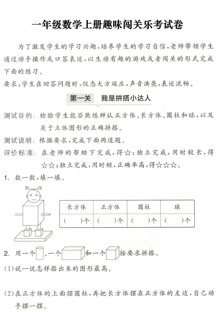 【试卷】一年级数学非纸笔考试《趣味闯关乐考试卷》人教版25秋最新版