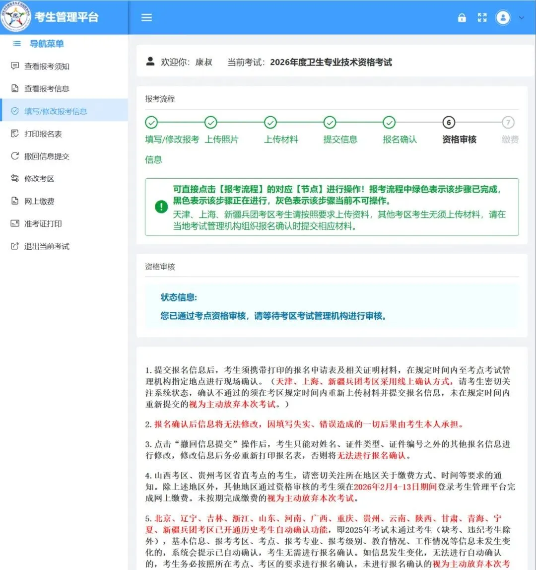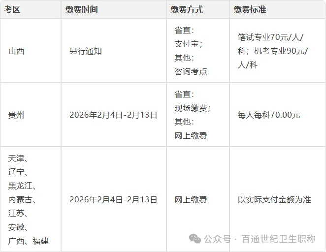 山西考区缴费时间另行通知,该考区考生请密切关注当地卫生健康委或考试机构官方通知,避免错过缴费时间;贵州省直考区需前往指定地点现场缴费,务必提前了解现场缴费的时间、地点及所需材料。