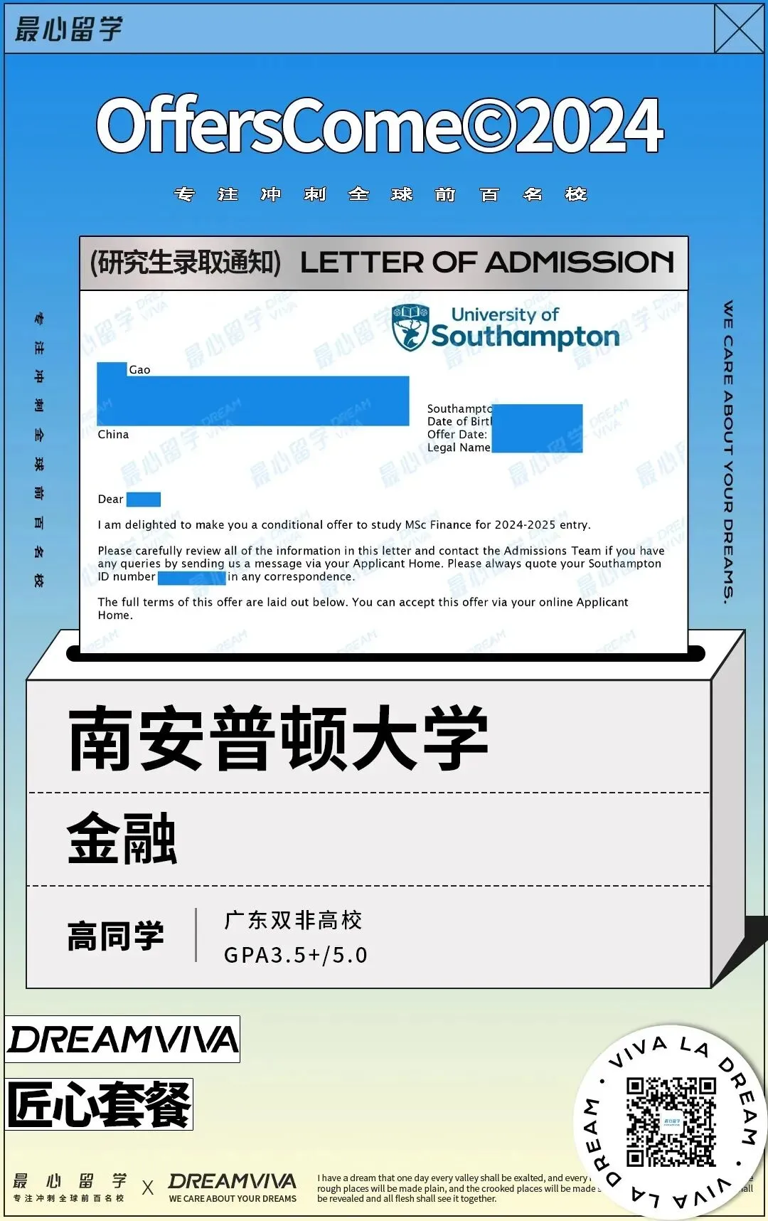 还好朋友推荐了最心,蕾酱老师第一时间安抚我的情绪,两天就拿出了详细方案,还考虑到我的情况制定了 “香港冲刺 + 英国保底” 的策略,让我能专心备战雅思,不用分心申请的事,选对机构真的太重要了!”