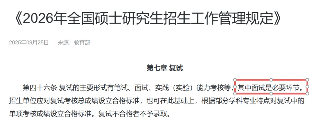 2026年新规:复试可包含笔试、面试、实践能力考核等多种形式,但其中“面试是必要环节”。