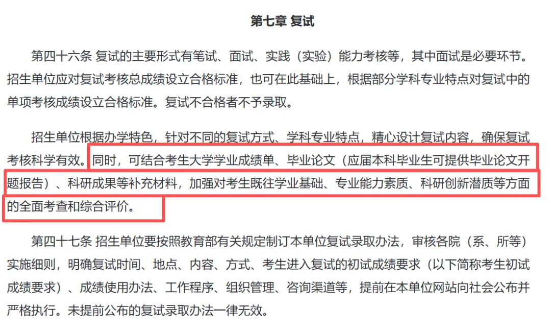 招生单位将结合考生大学成绩单、毕业论文、科研成果等补充材料,全面考查考生的学业基础、专业能力及科研潜质,不再单纯依赖初试分数。