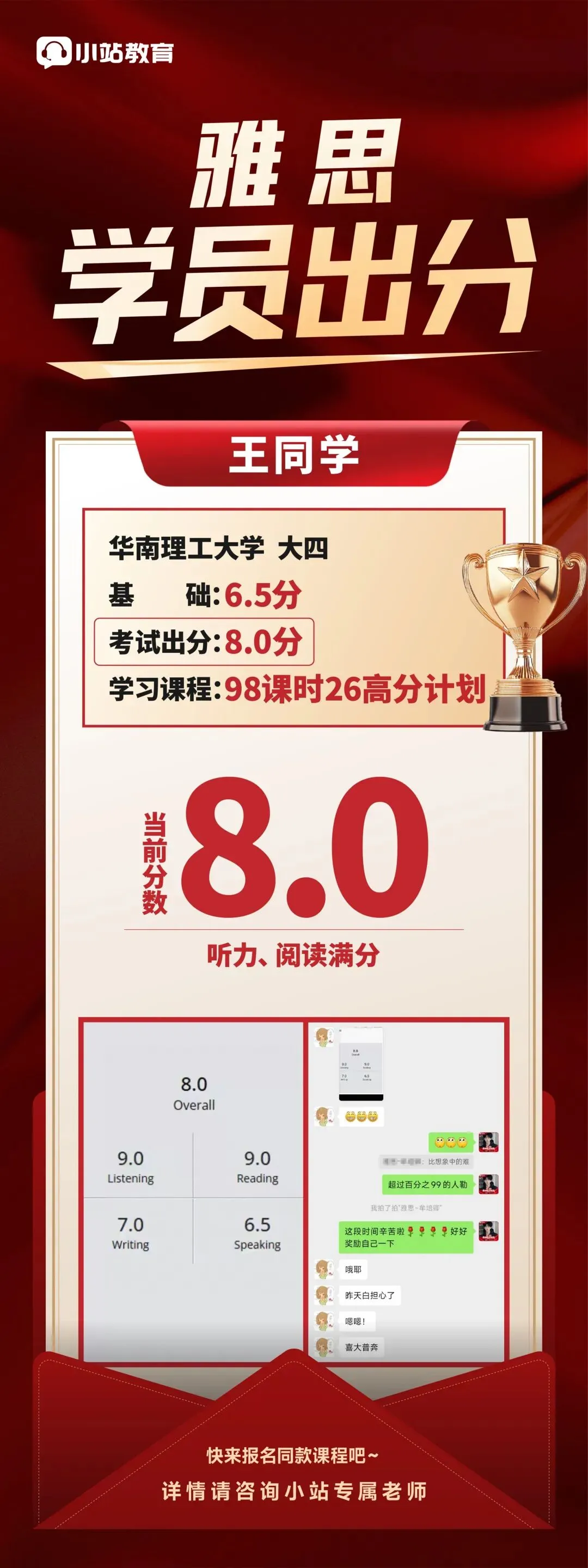 压缩备考周期:通过完备的课程体系和贴心的课后服务有效缩短学习时间,最快2-3个月即可实现1.5分提升,为后续留学申请和其他学习任务预留充足时间;