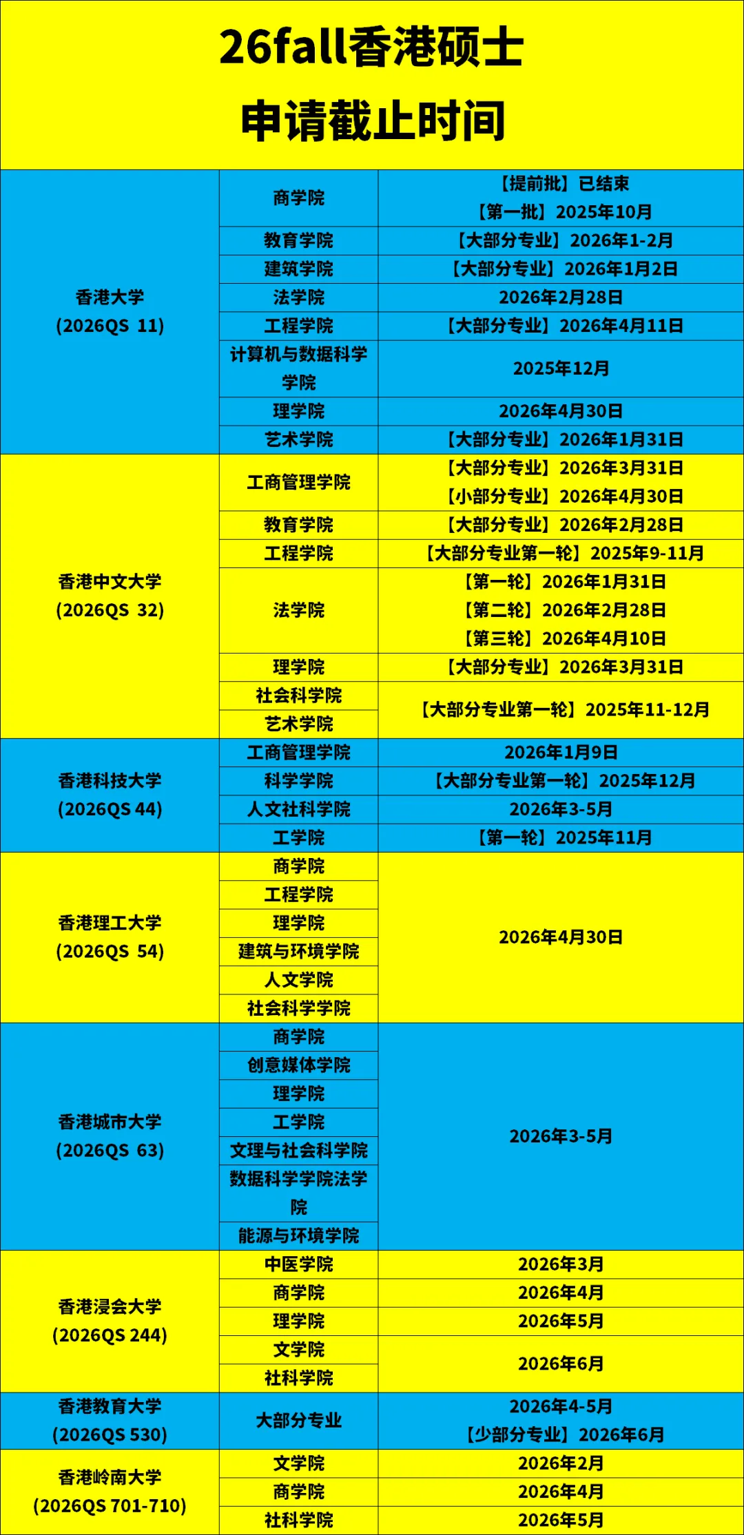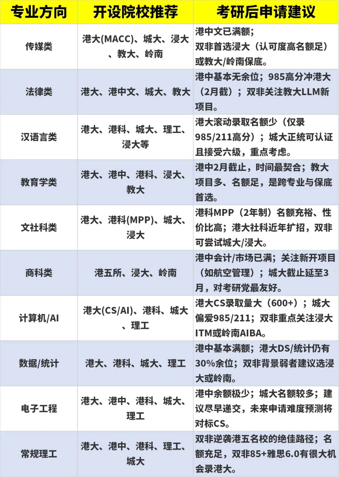 在了解香港硕士留学申请条件之前,我们先带大家盘点考研后仍然可以申请的港硕方向!不同专业方向与不同院校,考研后申请策略不同,华樱团队资深老师帮大家进行了整理与建议,供大家参考: