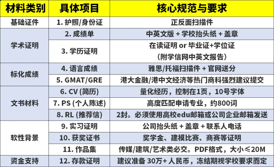 提前准备材料:有备无患,我们帮大家整理了港硕核心材料清单,供大家参考