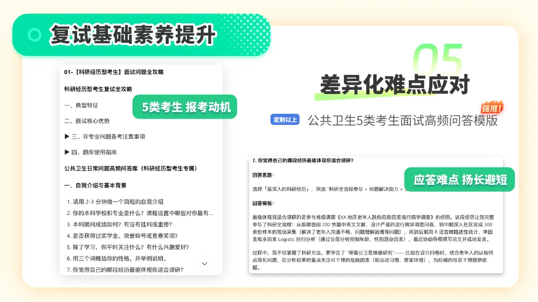 1️⃣ 坦然面对无科研,主动补位:被问科研经历时,不回避、不自卑,按“坦诚短板→展示替代经历→说明学习成果→表达科研意愿”四步答,比如“我目前没有正式科研经历,但通过课程设计掌握了基础数据处理方法,现在每周读1篇公卫文献,正在补充科研思维”;