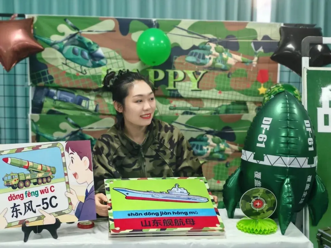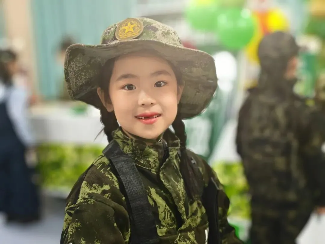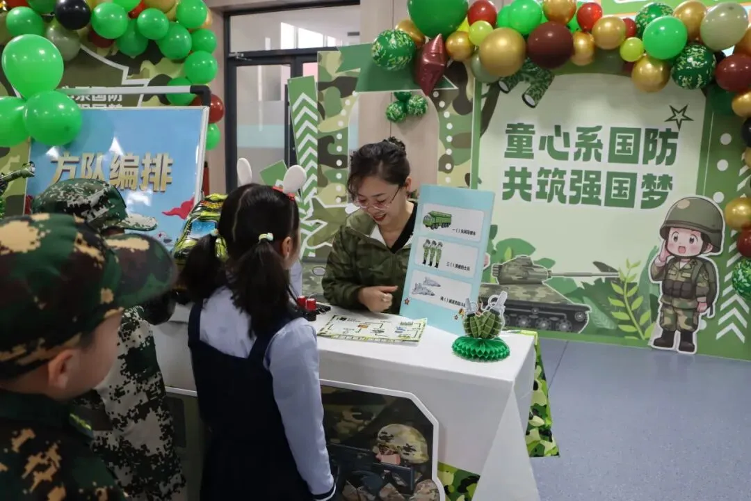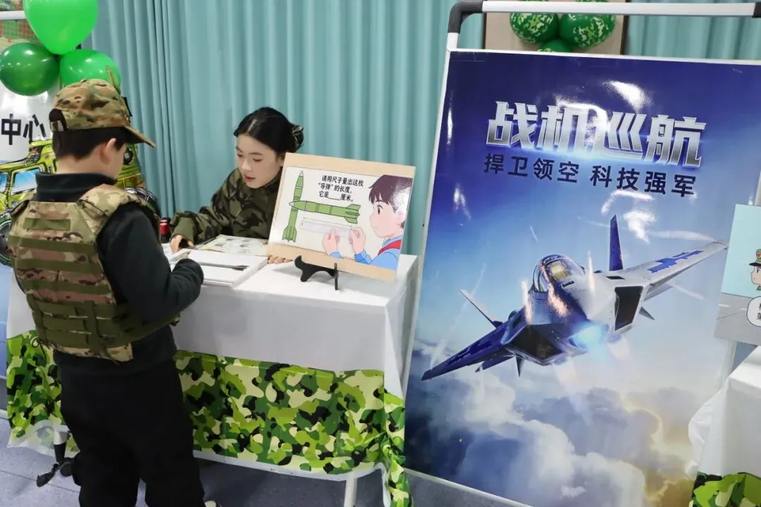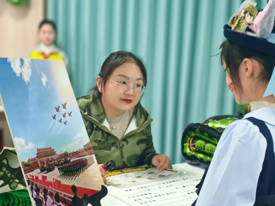 二年级学生也同样展现出色能力:“作战指挥中心”里,他们灵活运用乘法解决实际问题;“战机巡航”环节,手执学生尺精细测量,汇报数据一丝不苟;“队列校准”时,快速计算战士间距,展现数学在生活中运用的能力。语文方面,“机密电报”考查部首查字法,学生迅速定位生字并组词;“密令破译”中,充满爱国情怀的原创儿歌被声情并茂地朗读出来;“检阅方队”前,学生结合阅兵图片进行有条理的表达,语言流畅生动。英语环节则结合国防主题,拓展了学生的跨文化认知。