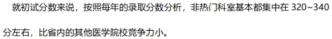 就初试分数来说,按照每年的录取分数分析,非热门科室基本都集中在320~340分左右,比省内的其他医学院校竞争力小。