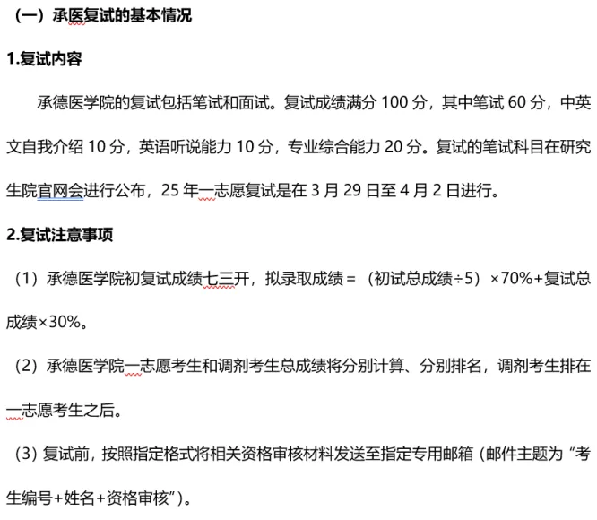 承德医学院的复试包括笔试和面试。复试成绩满分100分,其中笔试60分,中英文自我介绍10分,英语听说能力10分,专业综合能力20分。复试的笔试科目在研究生院官网会进行公布,25年一志愿复试是在3月29日至4月2日进行。