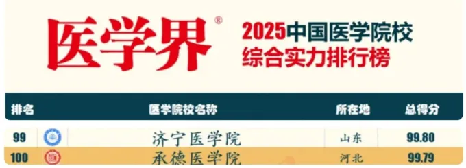 1.学院实力:2025医学界中国医学院校综合实力排行榜-承德医学院第100名;2025软科中国大学临床医学排名未上榜。